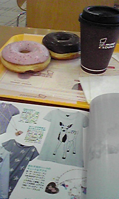 近くのイオンで主人の散髪待ち。ブラリと洋服とかウィンドーショッピングした後はフードコートで一人、ファッション雑誌見ながらドーナツでお茶中。